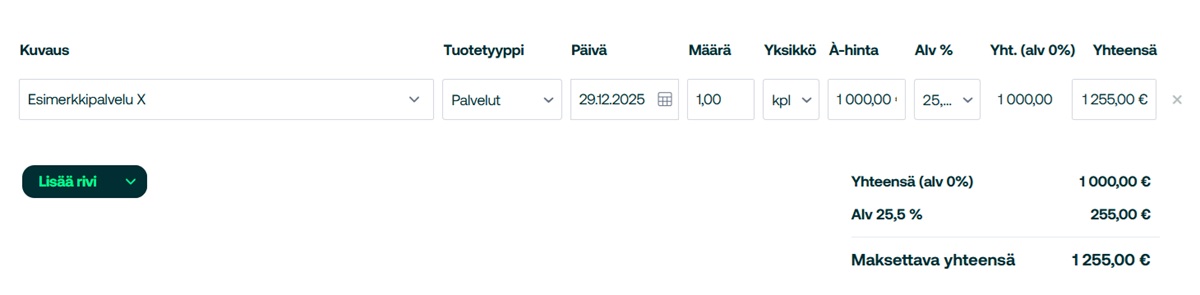 Oletuksena esimerkeissä on 25,5 prosentin arvonlisäverokanta.